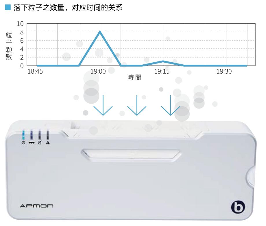 APMON采即时监控,纪录粒子落下发生的高峰时间,进一步比对发生当下的人、事、物行为,找出引发落尘的“程序”“行为”。这一检测粒子发生原因,并且抑制粒子发生的过程,有助于降低5μm以上的粒子附著。是欧规标准中的重要检讨项目。